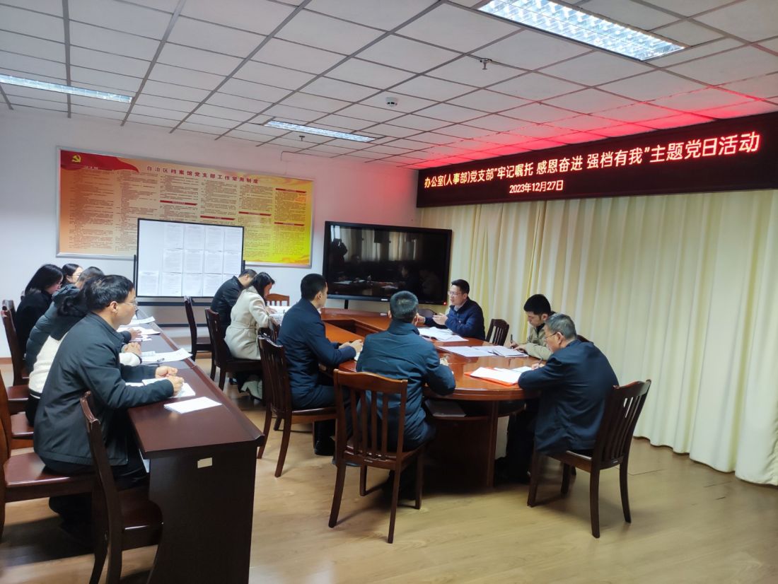 为深入学习贯彻习近平总书记视察广西重要讲话精神,以总书记重要讲话精神为动力,凝聚起“三服务”工作的奋进力量,更好地履行抓落实基本职能,12月27日,自治区档案馆办公室(人事部)党支部开展“牢记嘱托、感恩奋进、强档有我”主题党日活动。