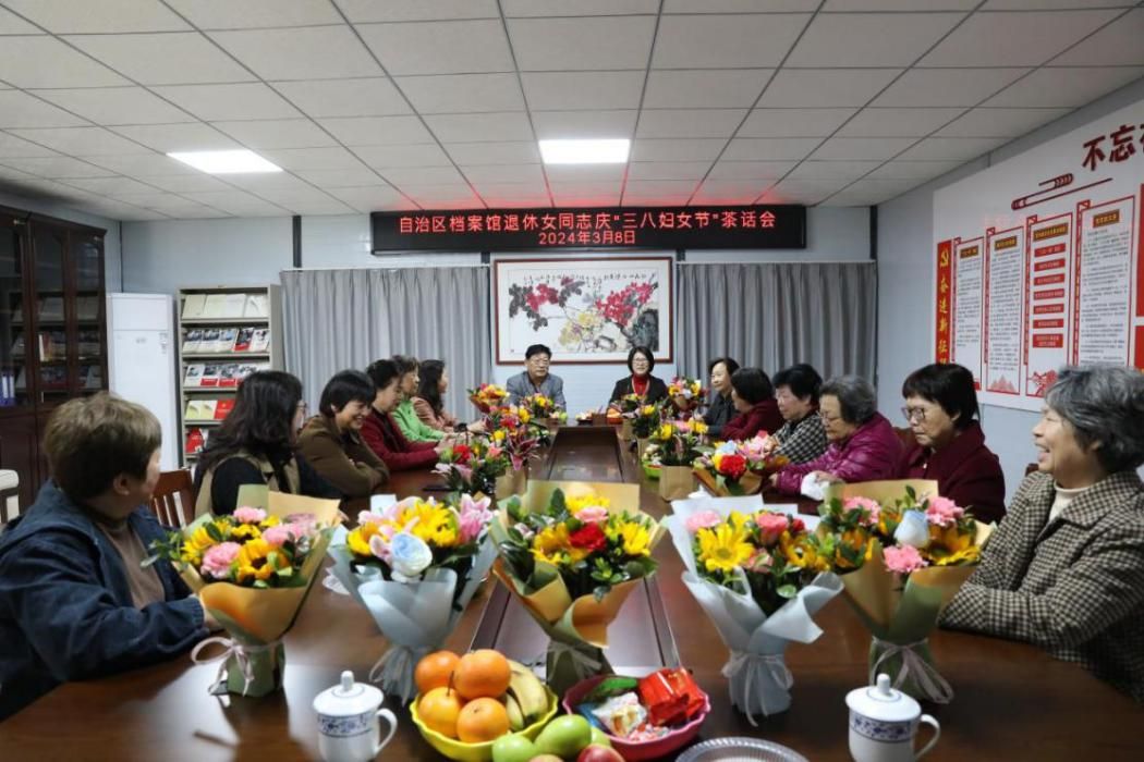 3月8日上午,自治区档案馆组织开展退休女同志庆“三八妇女节”茶话会,邀请退休女同志到馆欢聚一堂,庆祝属于自己的节日。自治区档案馆副馆长蒋宏灵对前来参加茶话会的退休女同志表示热烈欢迎并致以节日祝贺,对全馆退休女同志基本情况、今年老干部工作的总体设想作了介绍,就老干部工作和具体活动方式等向代表们征求了意见建议。会议现场氛围热烈,参会代表们在发言中表示:退休妇女同志对自治区档案馆一直以来的重视和关怀深表感谢,通过畅谈“身边人”“身边事”发生的显著变化,切实感受到了祖国的强大,更加明白加强党的领导的重要性,进一步坚定政治立场,更加自觉地与以习近平同志为核心的党中央保持高度一致。
