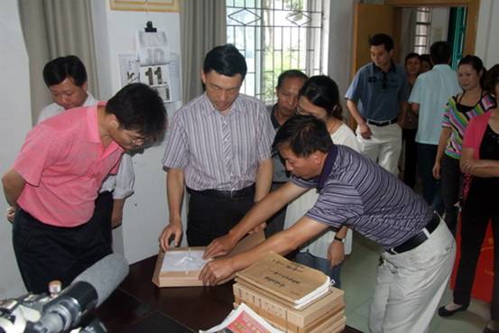 自治区档案局局长黄明初(左三)在凌云县档案馆察看林改档案情况