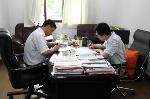 自治区档案局局长黄明初(左)陪同辽宁省档案局局长孙成德参观库房