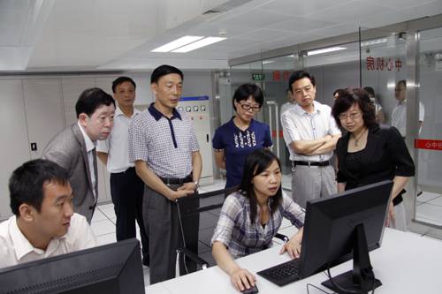 黄明初局长(后右四)陪同辽宁省档案局副局长许桂清(后右三)一行参观中心机房