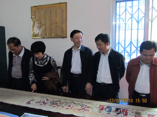 自治区档案局局长黄明初(中)在恭城县县长林武民(右二)陪同下查看国家重点抢救档案《梅山图》。