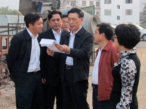 黄明初局长(中)在恭城县林武明县长(左一)、王桂英副县长(右一)等陪同下到档案馆新址了解情况。