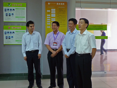柳州市档案局副局长罗方贵(左一)、何振邦(左二)陪同下检查柳州市档案馆查阅大厅服务情况