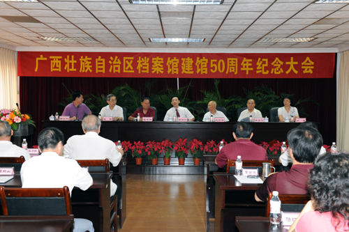 大会由自治区档案局(馆)副局(馆)长胡冬林主持,副局(馆)长史博在会上宣读了国家档案局中央档案馆,自治区党委书记郭声琨、自治区主席马飚为纪念自治区档案馆建馆50周年发来的贺信。国家档案局中央档案馆,郭声琨、马飚的贺信在充分肯定自治区档案馆建馆50周年取得非凡业绩的同时,希望自治区档案馆以建馆50周年为新的起点,以守护历史,传承文明为己任,牢记使命,开拓进取,紧紧围绕党委和政府工作大局,加快推进档案各项功能建设,努力把自治区档案馆建成档案安全保管基地,爱国主义教育基地和档案利用中心、政府信息查阅中心、电子文件中心“五位一体”的公共档案馆,为推动我区科学发展、和谐发展、跨越发展作出新的贡献。自治区档案局局长、自治区档案馆馆长黄明初作了题为《春华秋实五十载 齐心协力谱新篇》的报告,他从领导重视,各方支持,档案馆事业发展环境不断优化;夯实基础,规范管理,档案馆各项业务建设成绩显著;走出封闭,创新机制,档案馆社会服务功能不断拓展;加强培养,提升素质,促进档案干部队伍全面发展等四个方面全面回顾和总结了自治区档案馆建馆50年来的发展成就和经验。他表示,50年是一个里程碑,更是一个新起点。自治区档案馆全体同志将以此为契机,继续发扬档案工作者忠于党和人民的崇高思想,维护历史全貌的求实精神,无私奉献的高尚情操,艰苦拼搏的顽强作风,开拓进取,不断创新,扎实推进档案馆各项工作,努力推进覆盖人民群众的档案资源体系,方便人民群众的档案利用体系和确保档案安全保密的档案安全体系,努力把自治区档案馆建成一个面向社会,服务百姓的公共档案馆,使档案工作更好地为社会各界和人民群众服务,为建设富裕文明和谐新广西作出新的更大的贡献。