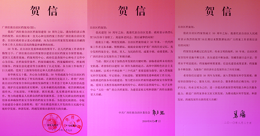 国家档案局、中央档案馆以及自治区党委书记郭声琨、自治区政府主席马飚的贺信