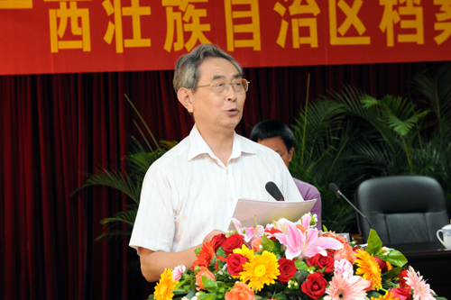 会上,原自治区档案馆馆长温强、原自治区档案馆副馆长谢岳山;收集保管处调研员罗祖琨,编研利用处处长覃世进,档案信息化工作处主任科员蒙斌作了发言。