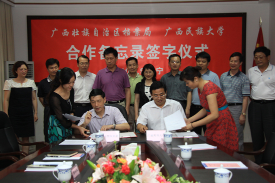 6月9日, 为进一步满足广西经济社会发展对更多的高层次创新型和应用型档案专业人才的需求,充分整合广西壮族自治区档案局(馆)与广西民族大学的馆藏、人才及教育教学资源,提高档案学专业教学科研水平,改革人才培养模式,提高社会服务能力,提升广西档案学在国内乃至东南亚的知名度和影响力,广西壮族自治区档案局和广西民族大学商定加强双方在人才培养激励、科研开发及学术交流发展等方面的合作。合作项目签字仪式在南宁举行。