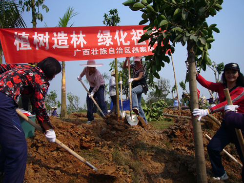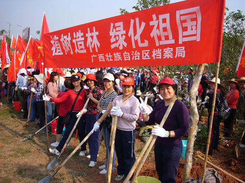 3月5日,南宁的春天,风和日丽,春光明媚。在喜迎“三八”国际劳动妇女节100周年到来之际,自治区档案局(馆)妇委会为让南宁绿城的树更绿,天更蓝,空气更清新,环境更优美,人与自然更和谐,积极组织妇女同志到南友高速公路吴圩立交绿化区参加自治区妇联和广西交通投资集团南友高速公路运营公司开展的“百年巾帼树,造家庭幸福林”植树活动。简短的植树活动仪式后,局(馆)的姐妹们就汇入植树的妇女大军中,抬树的抬树,铲土的铲土,浇水的浇水,一棵棵树苗在大家辛勤的劳动中迎风挺立。中午时分,便与南宁市和区直机关的妇女同胞们共同完成了植树任务,以实际行动迎接自己节日的到来。