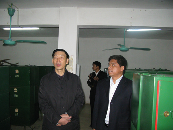 黄明初局长(左一)在大新县委书记雷永达(左二)陪同下到大新县档案局档案库房检查档案保管情况。