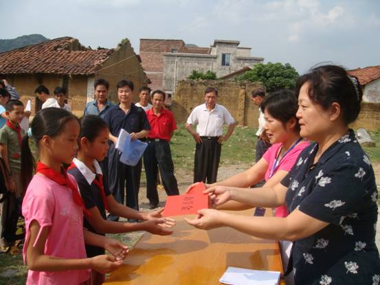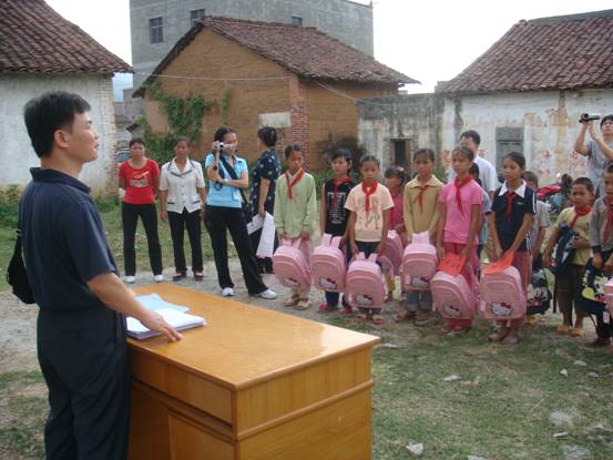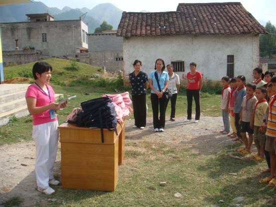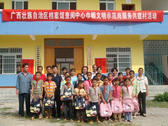 为了更好地推动档案查阅利用岗创建“巾帼文明示范岗”,进一步服务社会主义新农村建设,10月21日,永乐汇查阅中心巾帼文明示范岗创岗工作人员在深入学习实践科学发展观活动中,前往局(馆)定点扶贫村-武宣县桐岭镇大同村开展以“创建巾帼文明岗,结对扶助贫困生”为主题的活动,向大同小学的15名贫困学生赠送了书包、文具盒等学习用品,并与两名学习成绩优秀的学生开展结对助学活动,对其发放了助学金。