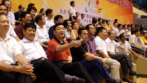 自治区档案局(馆)长黄明初(前排左三)在自治区直属机关第五届职工运动会上观看广播操比赛