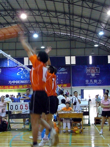自治区档案局男子气排球代表队的成功拦网