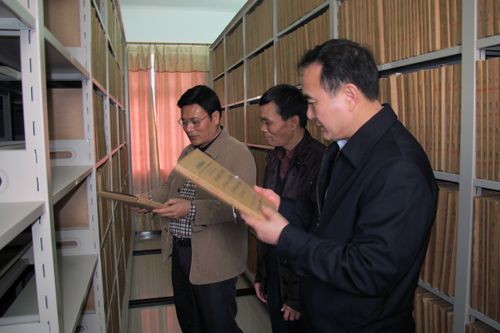 图为自治区档案局jz局长黎富文(右一)在横县档案馆检查档案安全管理情况。