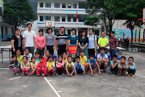 自治区档案局副局长覃兰花一行向玉业村小学赠送慰问品并与老师学生们合影