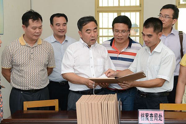 国家档案局副局长杨继波(左三)在自治区档案局局长黎富文(右二)的陪同下到马山县民族村检查精准扶贫档案工作情况