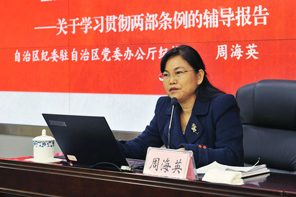 自治区纪委驻自治区党委办公厅纪检组组长周海英在会上作专题报告