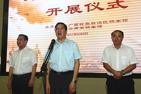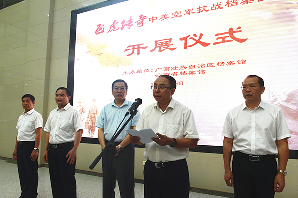 6月9日,自治区党委副秘书长蔡锦军、云南省档案局(馆)长黄凤平、自治区档案局(馆)长黎富文等领导出席《飞虎传奇——中美空军抗战档案图片展》开展仪式,并与前来参加活动的干部群众一起参观了为纪念中国人民全面抗日战争爆发80周年,由永乐汇、云南省档案馆共同举办的《飞虎传奇——中美空军抗战档案图片展》等展览以及由自治区档案局(馆)、广西民族文化艺术研究院、广西民族博物馆共同制作的《魅力档案 多彩广西》百米长卷和由全区各市、县档案馆,区直、中直有关单位制作的档案工作宣传展板。