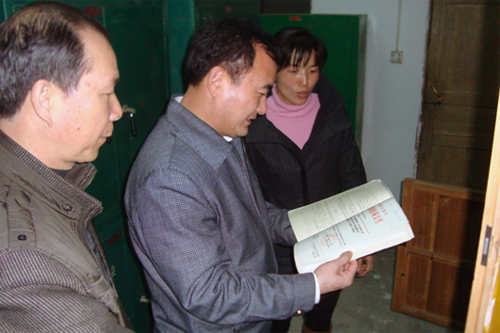 自治区档案局局长黎富文(中)在贵港市档案局局长董兆春(左)、港南区档案局局长吴红(右)陪同下查看档案