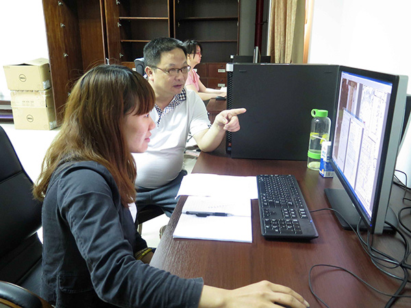 图为工作人员正在对档案数字信息进行“彩色转黑白”工作