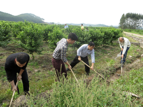 在龙坪屯廖声陆家的果园里,帮扶干部撸起袖子拿机锄头、铲子,背起喷雾器,帮贫困户的果树除杂草,给果树喷农药,给果地开沟排水。局领导边劳动边和农户了解农户在发展林果产业中遇到的困难及问题,广泛收集社情民意,并鼓励他们树立发展产业的信心和决心。