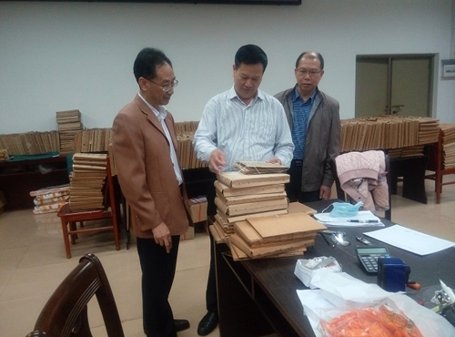 梧州市委常委、秘书长黎永益(左二)在查看进行数字化的档案