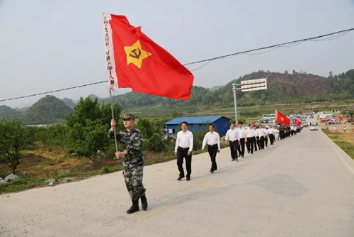 4月4日上午8点30分,祭奠活动准时开始。活动分两个阶段进行。第一阶段开展缅怀革命先烈活动,活动由县委副书记陈礼兵主持,全体人员庄严肃立,向革命先烈默哀致敬,并依次瞻仰烈士陵园,敬献鲜花。整个祭奠活动庄重肃穆。第二阶段开展重走长征路活动,该活动举行了简短的授旗仪式,全体人员在党旗指引下,从酒海井出发,开始了重走长征路活动。