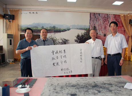 长期以来,国内外知名人士及区、市、县领导对宁明县档案工作十分重视和关心,最近,中科院院士、中国高能物理研究所所长、世界著名物理学家郑志鹏教授回家乡宁明县考察工作,专门为宁明县档案馆作了“宁明档案,服务宁明,发展宁明”的题词,图为题词后,郑教授(右二)与宁明县委书记蓝锋杰(右一)、县长刘勇(左二)、县档案局局长何景明合影留念。