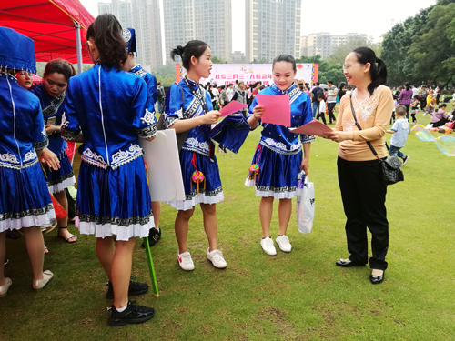 图为2018年4月23日,贵港市档案局党员宣传服务队员在“壮族三月三-八桂嘉年华中国梦民族情”民族节庆活动现场向群众宣传档案知识(陈莉云摄)