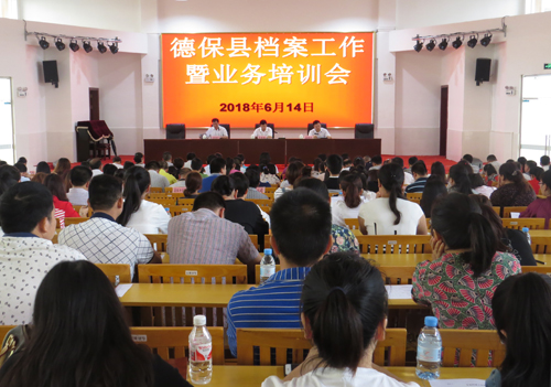 2018年6月14日,德保县召开了全县档案工作暨业务培训会议。县委常委、宣传部部长、副县长覃程魁亲自出席会议并讲话,对如何进一步做好档案工作强调了三点意见:一是提高认识,找准政治站位,牢记档案工作使命,二是立足职能,狠下功夫,开创档案事业新局面,三是加强领导,落实责任,为档案事业健康发展提供有力保障。会上,德保县档案局局长黄都城传达了全国、全区、全市档案工作会议精神,总结了全县2017年档案工作,部署了2018年档案工作。会议邀请了百色市档案局业务指导科副科长黄建好和德保县芊晨电子有限公司对文书档案、照片档案、实物档案和GD2016的安装使用进行了培训。各乡(镇)和各机关、企事业单位分管档案工作的领导及专(兼)职档案员等228人出席会议。