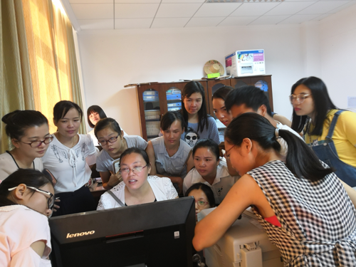 2018年6月8日大新县档案局办公室主任黄贵珍(左前三)到桃城镇扶贫办培训13个村信息员2个镇级信息员整理识别类、施策类和脱贫户档案。图为安装和录入GD2000档案软件操作方法。赵锋敏摄