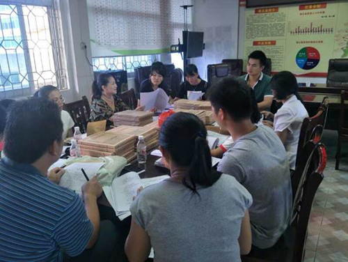 图为浦北县档案局丁小平(左中)在现场指导整理扶贫档案
