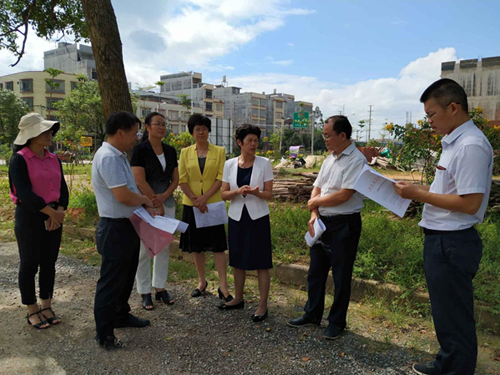 图为自治区档案局副局长覃兰花(右三)调研浦北县国家综合档案馆新建设项目选址情况