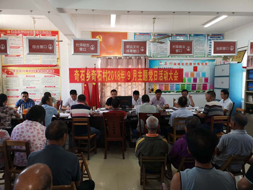 2018年9月21日,贵港市档案局挂点村港北区奇石乡奇石村在村委召开9月主题党日活动会议。这次党日活动的主题是:主动担当作为,助力基层治理。奇石乡挂村领导廖平贵副书记、村两委干部、驻村第一书记及工作队员、在家的部分党员代表约45人参加了会议。会议由村委副主任郑延奇主持,支书周异电和大家学习了关于进一步激励广大干部新时代新担当新作为的文件精神,驻村第一书记覃伟作了《发挥党员作用,勇于担当作为》的讲话。在党日活动中,还开展了献策献言和集中交纳党费活动。通过主题党日活动,引导基层党员自觉践行‘三严三实’,不断增强‘四个意识’,切实增强政治担当,适应新时代党的作风建设新要求。