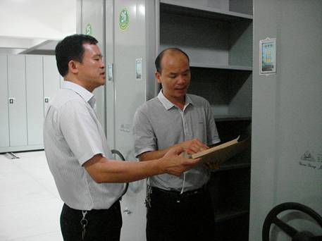 北流市委常委、市委副书记罗世才(左二)在北流市档案局局长陈静森(左一)陪同下查看馆藏档案管护情况。