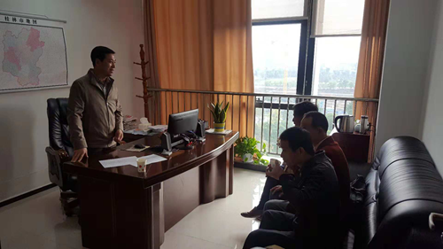 桂林市档案局局派驻平乐县源头镇启善村第一书记朱京祥(左一)与贫困户应聘人员在会议现场