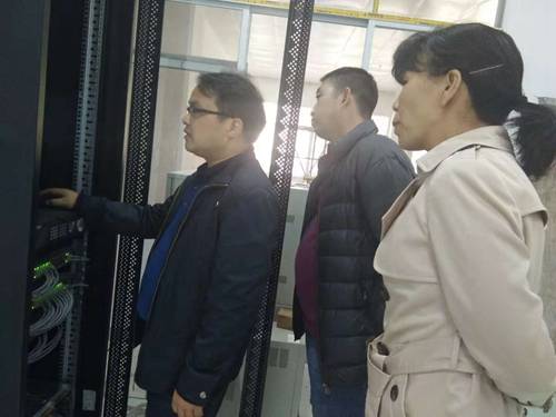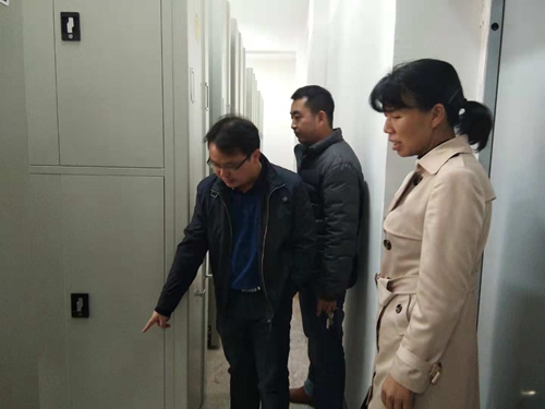 资源县档案局领导班子成员正在验收资源县综合档案馆密集架项目