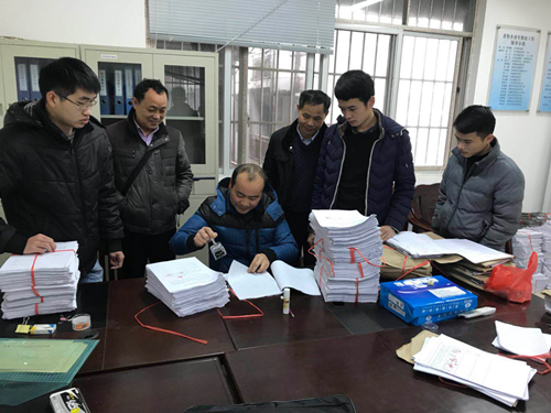 图为融水县档案局业务骨干韦汉德深入香粉乡指导土地延包档案整理