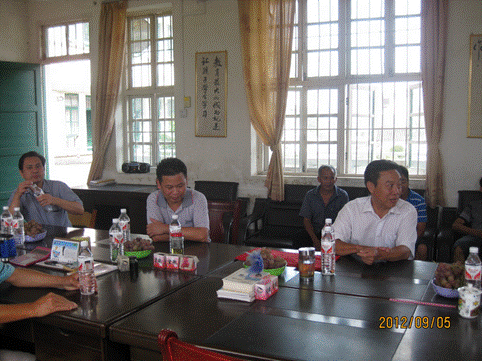 县领导林中贤(右一)、县档案局局长何涛(右三)导在枧头村小学办公室与教师们交谈。