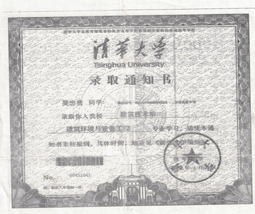 女儿清华大学录取通知书