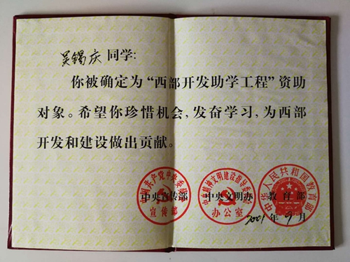 堂弟吴锡庆西部开发助学工程资助证书
