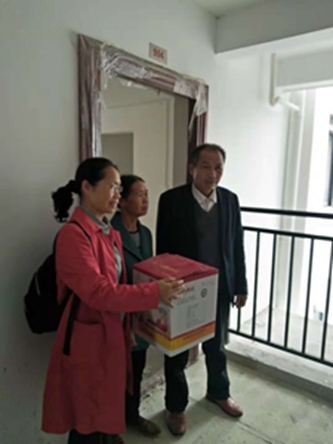 副局长潘长征(左一)向搬进新房子的帮扶对象潘增成送上取暖器