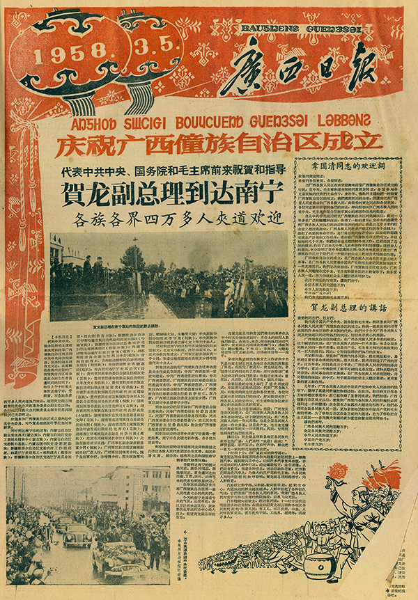 1958年3月5日,经党中央、中央人民政府批准成立广西壮族自治区,韦国清当选第一届自治区主席。报纸中记载,贺龙副总理代表党中央亲临南宁祝贺,并在南宁火车站及广西壮族自治区第一届人民代表大会上发表讲话。