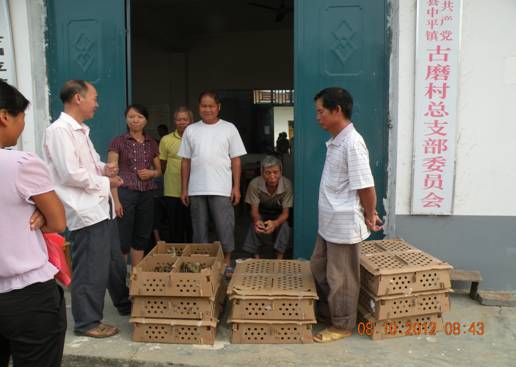 象州县中平镇古磨村是来宾市档案局和象州县档案局的扶贫联系点,为帮助该村寻求产业脱贫新路子,选派到该村担任党总支第一书记与新农村指导员在深入调研、举办山鸡养殖培训班的基础上,积极争取后盾单位支持,并于8月10日将价值5000元的1000只美国七彩山鸡苗赠送给古磨村委14户扶贫帮扶对象养殖。