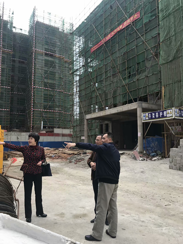 钦州市档案局局长翟飞雯(左一)、副局长宁忠(中)在钦北区档案局局长李森(右一)陪同下现场查看钦北区档案馆新馆建设情况。