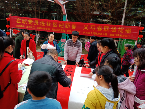 为认真贯彻落实党的十九大精神,营造“党建引领·共驻共建”的社区党建浓厚氛围,传承中华传统文化,歌颂美好生活,营造吉祥如意的春节气氛,1月19日下午,来宾市档案局联合市政管局、市城投集团等部门到来宾市兴宾区城北街道政和社区开展“我们的节日·春节”系列活动之“在职党员进社区迎新春 义写春联送祝福”活动,活动邀请来宾市书法协会成员及书法爱好者现场泼墨挥毫书写春联,广大居民群众纷纷闻讯赶来,争相挑选中意的春联请协会会员为自己书写,希望自己在新的一年里有新的气象。据悉,当天下午共免费向社区居民赠送100余幅春联。