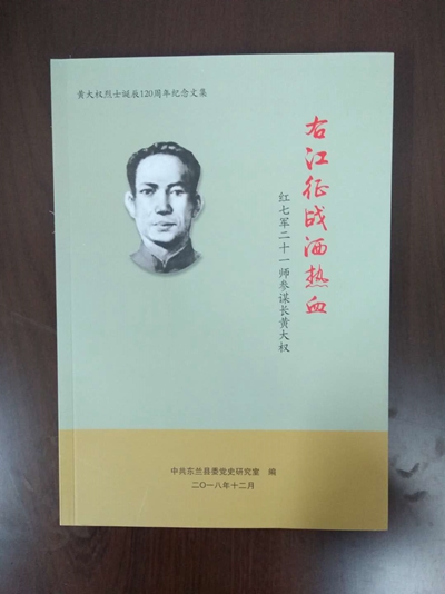 为纪念黄大权烈士诞辰120周年,东兰县委党史研究室于2018年12月编印《右江征战洒热血--红七军二十一师参谋长黄大权》。全书分四大部分。第一部分是黄大权传,比较全面系统地记叙他光辉战斗的一生;第二部分是摘录缅怀、纪念性文稿,侧重收录各界人士为缅怀烈士而撰写的具有代表性文章,从不同侧面反映黄大权同志光辉的革命足迹;第三部分是革命后代继承和发扬革命先辈的光荣传统,在社会主义建设中积极工作、作出贡献的事迹;第四部分是附录烈士生平大事记等资料。该书资料丰富,真实感人,是广大干部群众特别是青少年学生进行革命传统教育的好读物。