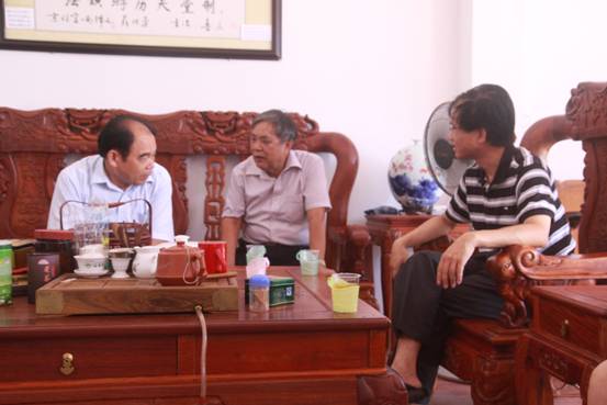 防城港市档案局领导与字喃传承人亲切交谈。左起:唐强光、苏维芳、许炳杰