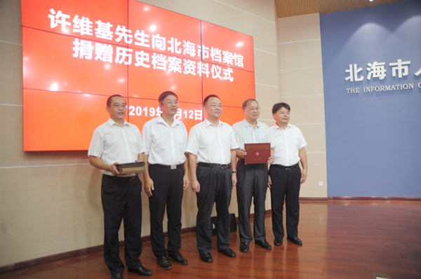 2019年9月12日下午,北海市档案局、北海市档案馆在北海市新闻发布厅举办许维基先生向北海市档案馆捐赠历史档案资料仪式和北海市档案资料征集新闻发布会。市委常委、市委秘书长彭鸣达出席捐赠仪式并向许维基先生颁发收藏证书。仪式由市委副秘书长、市委办副主任、市档案局局长赵京峰主持。
