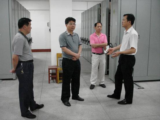 中共北流市委常委、市委办公室主任谢玉圣(左二)、副主任刘金强(左三)在北流市档案局局长陈静森(右一)、副局长杨华同(左一)的陪同下查看档案馆政府信息公开查阅点情况。